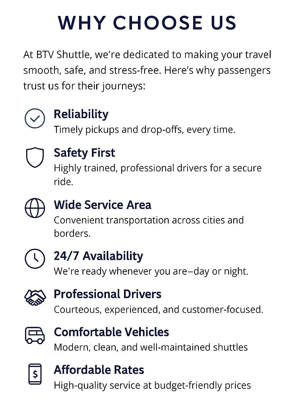 Quality transportation doesn’t have to come with a hefty price tag. At BTV SHUTTLE, we offer competitive rates without compromising on the quality of service you receive.